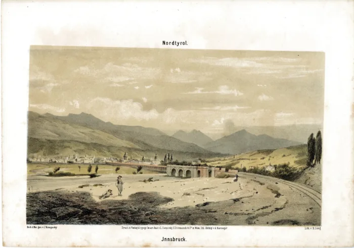 Der Startpunkt unserer Reise ist erwartungsgemäß der Bahnhof von Innsbruck. In der wunderschön kolorierten Lithographie…