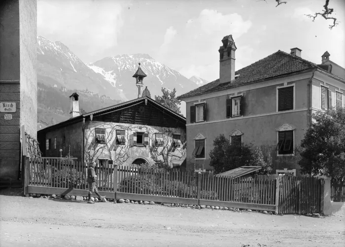 Die Serles schaut zwischen zwei Bäumen auf uns. Die Nockspitze versteckt sich hinter der Kurve…