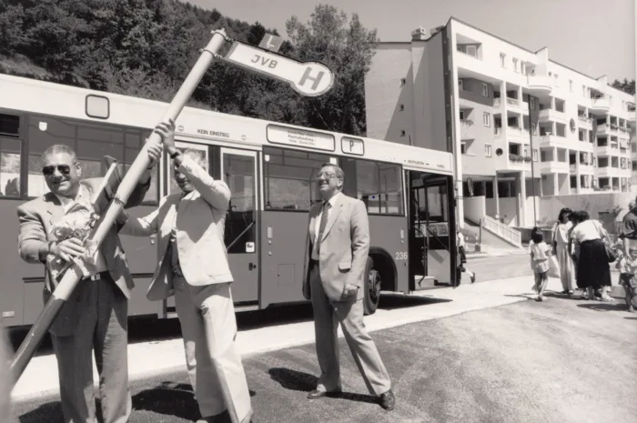 Der Künstler Karl Jenewein hat dieses Gebäudeensemble noch vor dessen Abriss zeichnerisch festgehalten. Rechts unten…