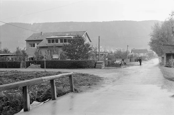 Die Aufnahme strahlt eine gewisse Trostlosigkeit in der Siedlung aus. Auf der unasphaltierten Straße hat…