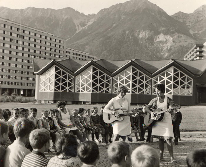 Eine Gruppe des Kindergartens Olympisches Dorf singt für den Fotografen ein Willkommenslied, begleitet von zwei…