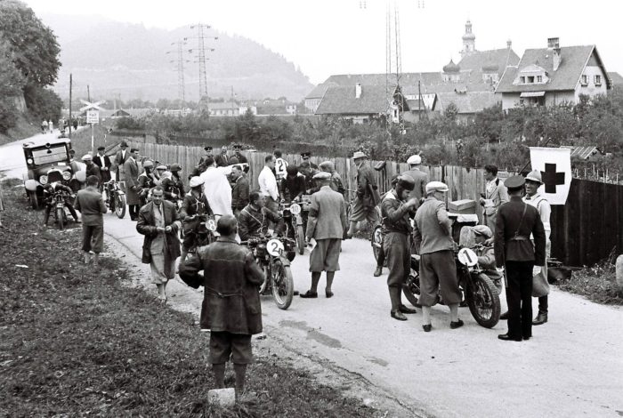 Wilten, Paschbergweg, in den späten 1930-er Jahren. Ein Motorradrennen kurz vor dem Start. Die Männer…
