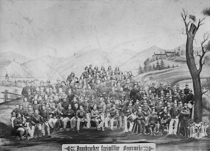 … der 1857 gegründeten Freiwilligen Feuerwehr Innsbruck entstand Anfang der 1870er-Jahre. Das stark retuschierte, aus…