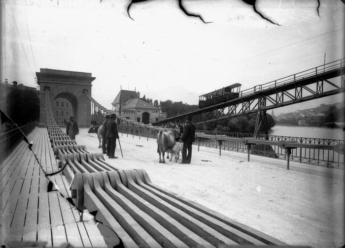 Wir blicken auf der Kettenbrücke nach Süden. Mitten auf der Brücke treffen offensichtlich zwei Bauerngruppen,…