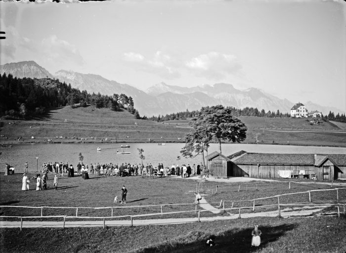 Der Lansersee gegen Norden; vermutlich um 1910. Im Hintergrund die Lanser Köpfe, ganz hinten das…