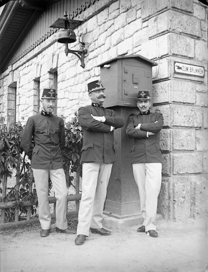 Drei Herren in der Uniform der k.k. Österreichischen Staatsbahnen vor einem Bahnhofsgebäude, vermutlich der Bahnhof…