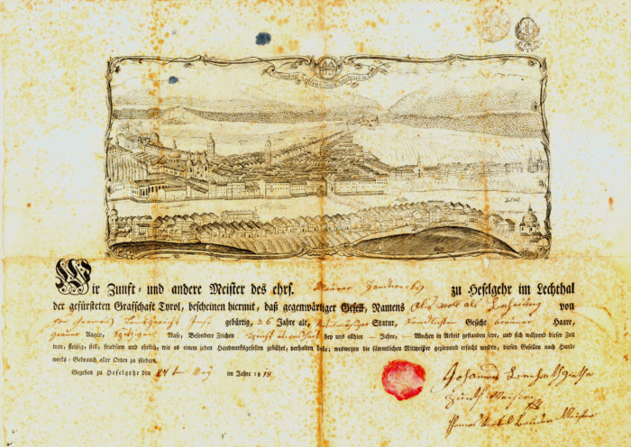 Bei diesem Dokument handelt es sich um einen Maurer-Gesellenbrief von Alois Moll aus dem Jahre…