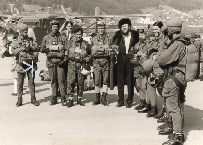 Ivan Rebroff posiert auf dem 1970 am Flughafen Innsbruck entstandenen Foto mit einer Gruppe Fallschirmspringer.…
