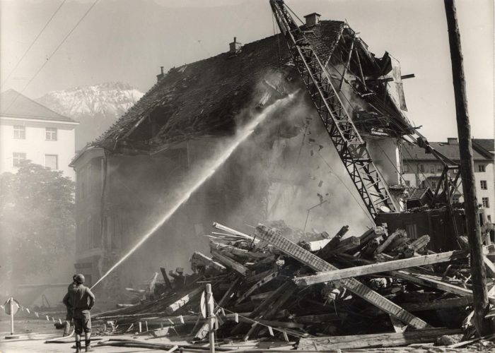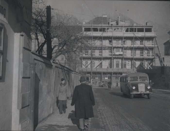 Mit dieser Aufnahme reisen wir zurück in das Innsbruck der Nachkriegsjahre. Im Hintergrund wird fest…