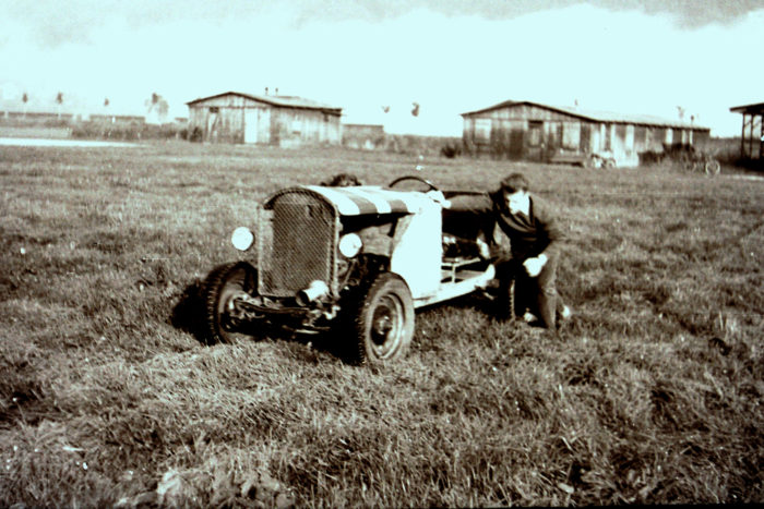 Ein junger Mann müht sich, einen Oldtimer durch tiefes Gras über eine Wiese zu schieben.…