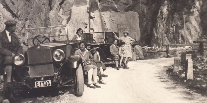 Ein junger Mann, vielleicht der Vater, und zwei Buben posieren auf einer imposante Beiwagenmaschine mit einer kleiner Tür an der Seite. Die stark gemusterten Jacken aller drei „Wüden auf ira Maschin“ lassen auf eine Verwandtschaft oder so schließen. Für eine Tracht ist das Muster auf der Kleidung wohl zu wenig.