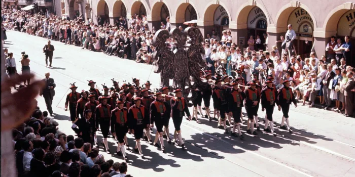 1. Das Foto stammt vom 11. November 1945 und zeigt die feierliche Heimkehr des Gnadenbildes von Maria Waldrast, beginnend mit einer Prozession bei der Pfarrkirche von Matrei am Brenner.