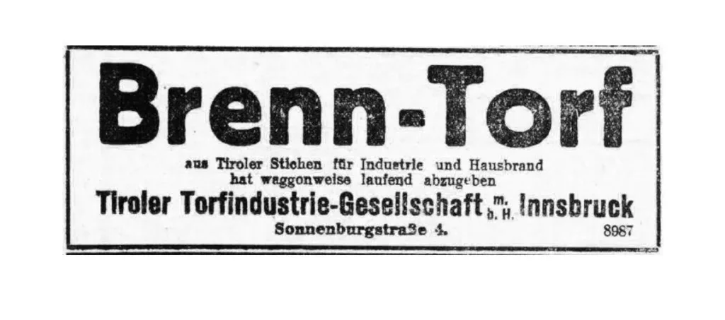 Ab Mitte Juni 1921 inseriert die T.T.I. den ganzen Sommer lang in den Innsbrucker Zeitungen, wie hier in den Innsbrucker Nachrichten, um den Absatz anzukurbeln. Ein Selbstläufer scheint das Geschäft mit dem Brennstoff aus dem Moor nicht zu sein.