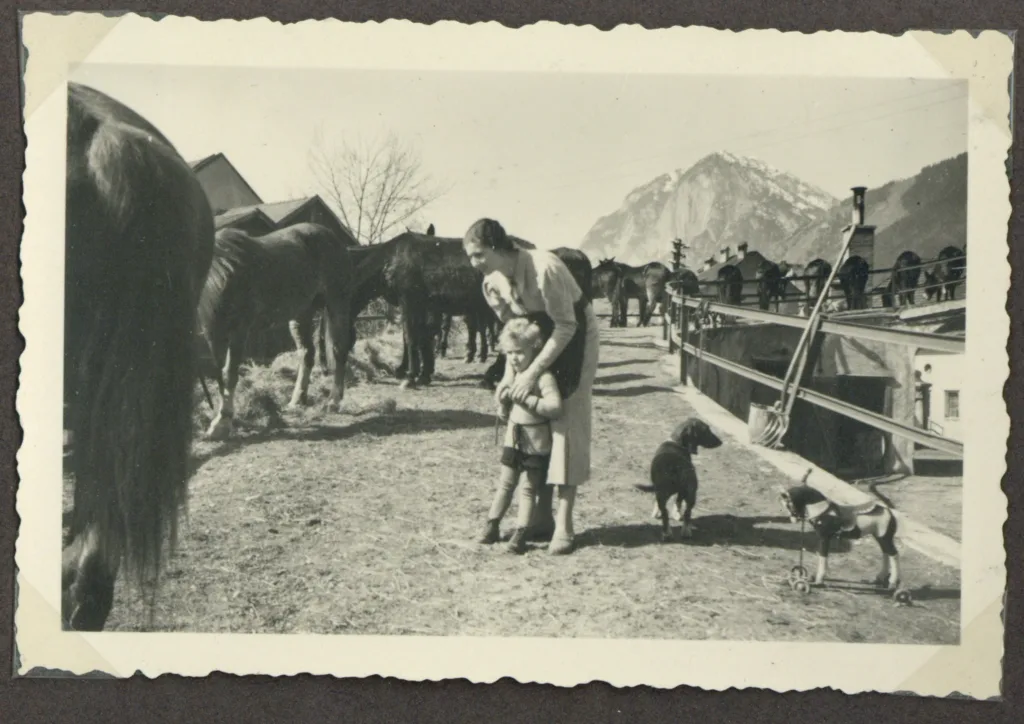 … da war Rudi Flunger III. König, und man würde es ihm nachsehen, wenn ihn im zarten Bubenalter der Rest der Welt noch wenig scherte. Unten ist wahrscheinlich das Foto mit den meisten Pferden zu sehen (aus Holz sowie aus Fleisch und Blut), das wir in unserer Sammlung haben. Und das mitten in der Höttinger Au, beim Rössl, gut bewacht von Dackel Diana. Alle diese Pferde standen in Diensten des familieneigenen Weinhandels.