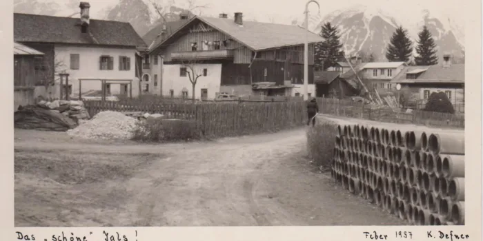 Wie diese Auflistung nahelegt, wurden bereits vor dem offiziellen Baubeginn mit ersten Arbeitsschritten (Holzschlägerungen, etc.) begonnen. Im Vorfeld wurde auch der Weg von der Hungerburg zum Titschenbrunnen ausgebaut, sodass auf dieser Strecke Fuhrwerke verkehren konnten. Vom Titschenbrunnen aus stiegen dann u.a. die Träger aus dem Pinzgau zwei Mal pro Tag zur Seegrube auf – im Schnitt trugen sie dabei 70 Kilo Material zum Bauplatz. Unser Titelfoto zeigt die Pinzgauer schwer bepackt beim Aufstieg.