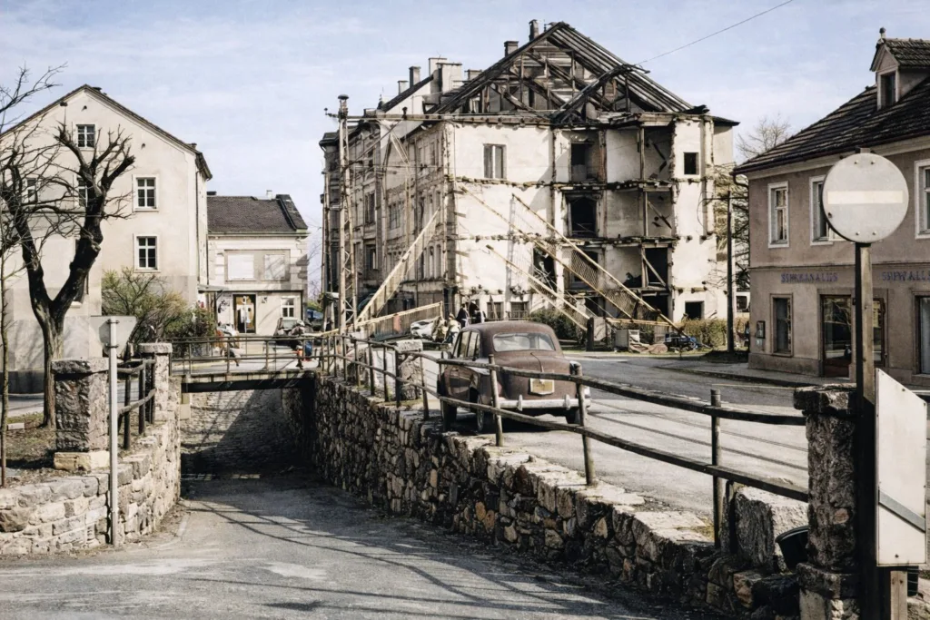 1. Danke für diese sehr interessanten Farbaufnahmen. Die zweite dürfte etwas später entstanden sein, ich kann bei der Bahnstrecke keine Fahrleitung mehr erkennen und die Schranken sehen bereits kaputt aus. Die Straßenbahnstrecke scheint auch nicht mehr in Betrieb zu sein, zu erkennen an dem Auto, das im Gleisbereich parkt. Es könnte 1956-1959 sein.