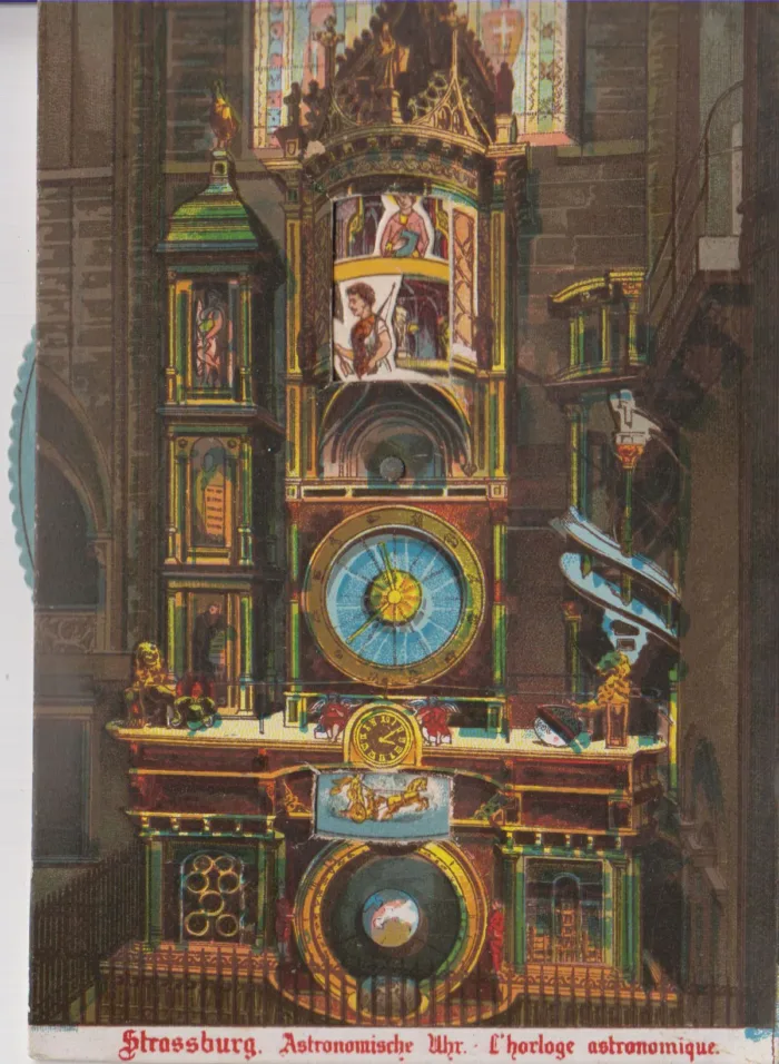 Das Titelbild zeigt die berühmte astronomische Uhr im Straßburger Dom. Auf der Adressseite wird die…