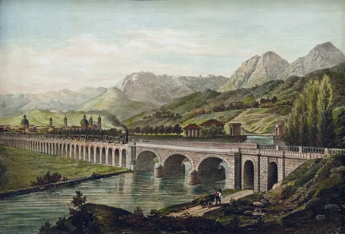 Diese wunderschöne, kolorierte Lithographie des Malers und Lithographen Basilio Armani dürfte wohl alle Eisenbahnfans in…