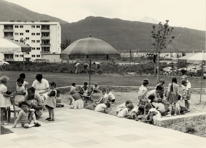 Am wohl größten (?) Tipi-Bestand Innsbrucks erkennbar sind historische Aufnahmen des Spielplatzes Sieglanger, den Kollege…