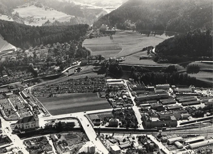 Etwas westlich von Schloss Mentlberg richtet sich der Blick heute vom Westen auf das Stadtgebiet.…