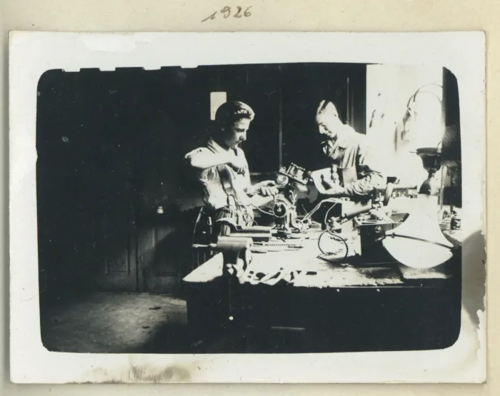 Die beiden jungen Männer, die hier 1926 in ihrer Handywerkstatt mit den angesagtesten Nussholz- und…