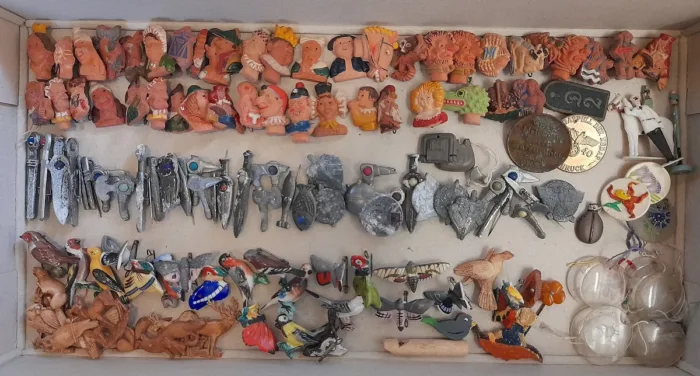 Hier zu sehen sind die Tonfiguren aus dem Bestand, zusammen mit kleinen Plastikschwertern und Äxten.…