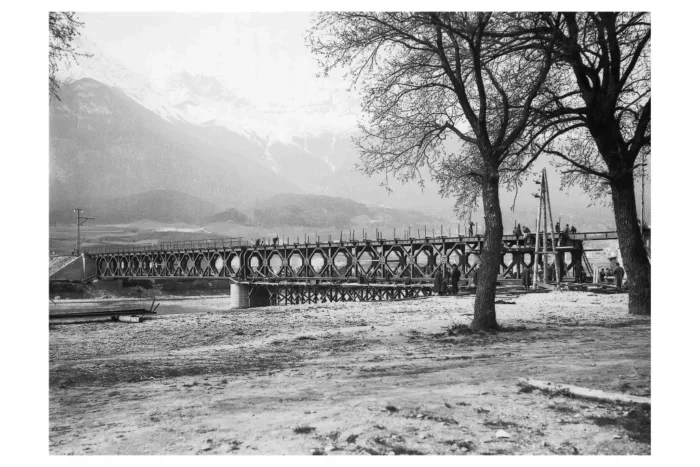 Dieses Foto zeigt Bauarbeiten an der Stahlkonstruktion der Innbrücke, die für die Erbauung der Karwendelbahn…