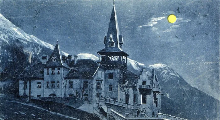 Auf unserer heutigen, abendlich kolorierten Ansichtskarte blicken wir auf den oberen Rennweg. Über der Nordkette…