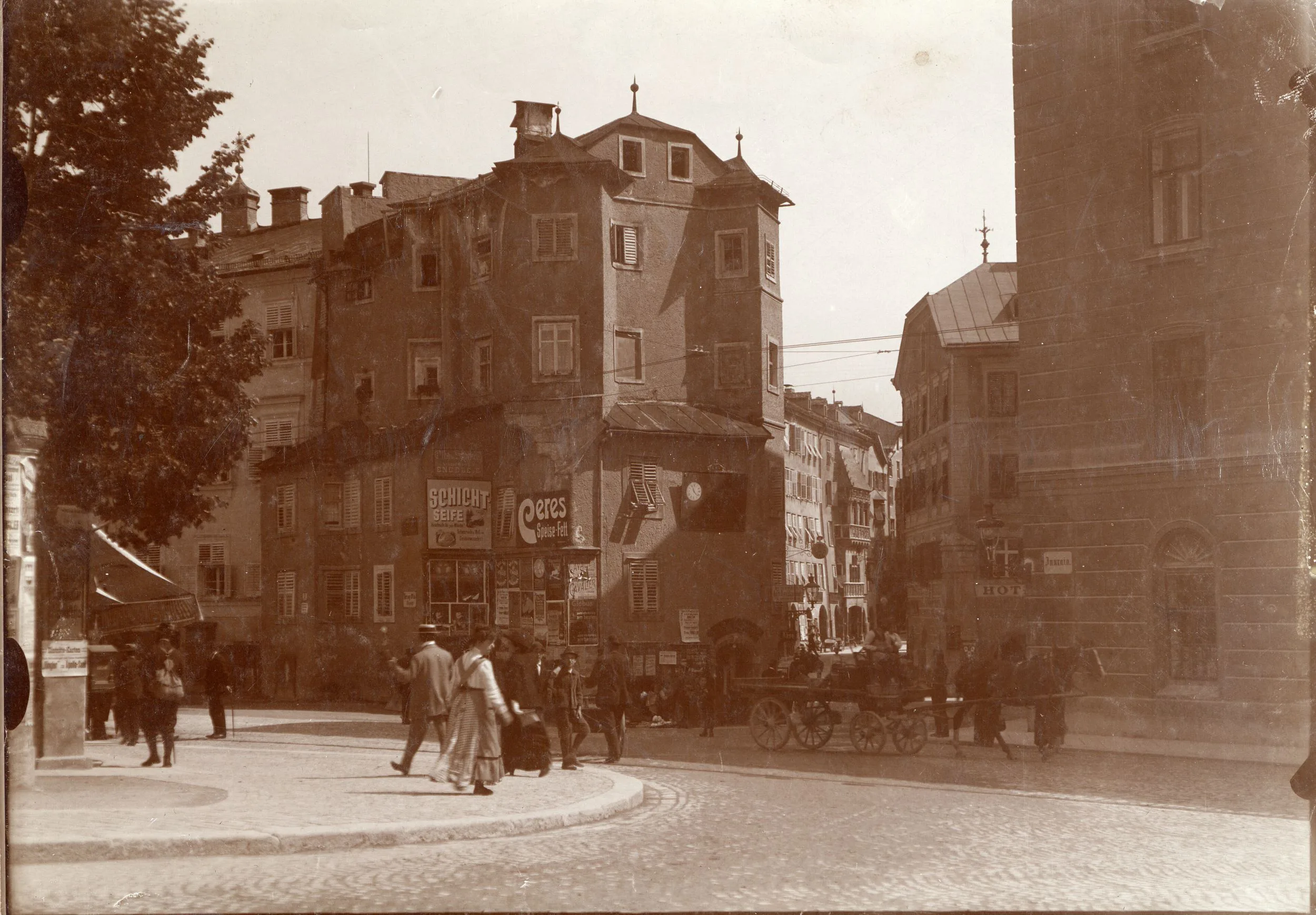 Wir blicken heute von der Innbrücke in Richtung Altstadt und Goldenes Dachl. Während es dort eher ruhig aussieht, ist an der Kreuzung einiges los: Menschen unterschiedlichen Alters beleben die Szenerie, auch ein Fuhrwerk mit Pferd ist zu sehen. Besonders fallen auch die zahlreichen Werbeplakate ins Auge, die nicht nur an der Ottoburg, sondern auch an einer Litfaßsäule bei der Innbrücke bzw. dem dortigen Kiosk zu sehen sind. Vielleicht könnten diese auch eine Möglichkeit sein, das Bild zu datieren. Während wir nämlich wissen, dass das Bild kurz vor Mittag aufgenommen worden ist, lautet die Datierung in unserer Datenbank lediglich „um 1900“. Das Fehlen des Denkmals „Vater und Sohn“ oder „Anno neun“, das 1909 geschaffen wurde und 1914/15 aufgestellt worden ist, ist jedenfalls ein eindeutiger zeitlicher Marker. Haben Sie Vorschläge oder sonstige Beobachtungen?