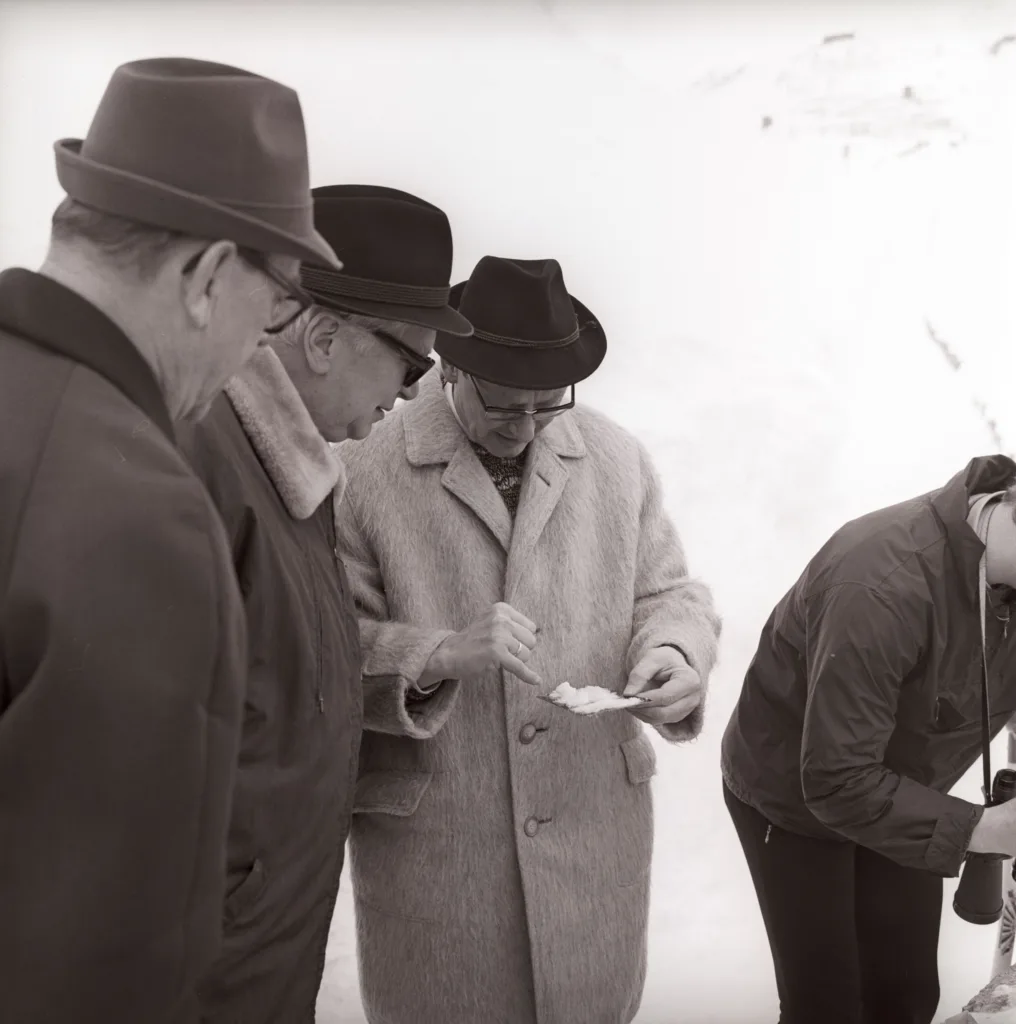 Die anderen Herren, die auf dem zweiten Foto zu sehen und allesamt mit Hut ausgestattet sind, scheinen sich ebenfalls die Beschaffenheit des Schnees anzuschauen. Allerdings ist zumindest einer von ihnen im Gegensatz zu den zwei Männern auf dem Titelbild nicht vom Lawinenwarndienst. Bei der Person in der Mitte handelt es sich um Bürgermeister Alois Lugger. Das lässt mich vermuten, dass die beiden fesch gekleideten Herren neben ihm möglicherweise aus seinem Umfeld kommen und ebenfalls einer anderen beruflichen Tätigkeit nachgehen. Bleiben nur noch die Fragen: Wer sind sie? Und was machen alle gemeinsam dort oben?