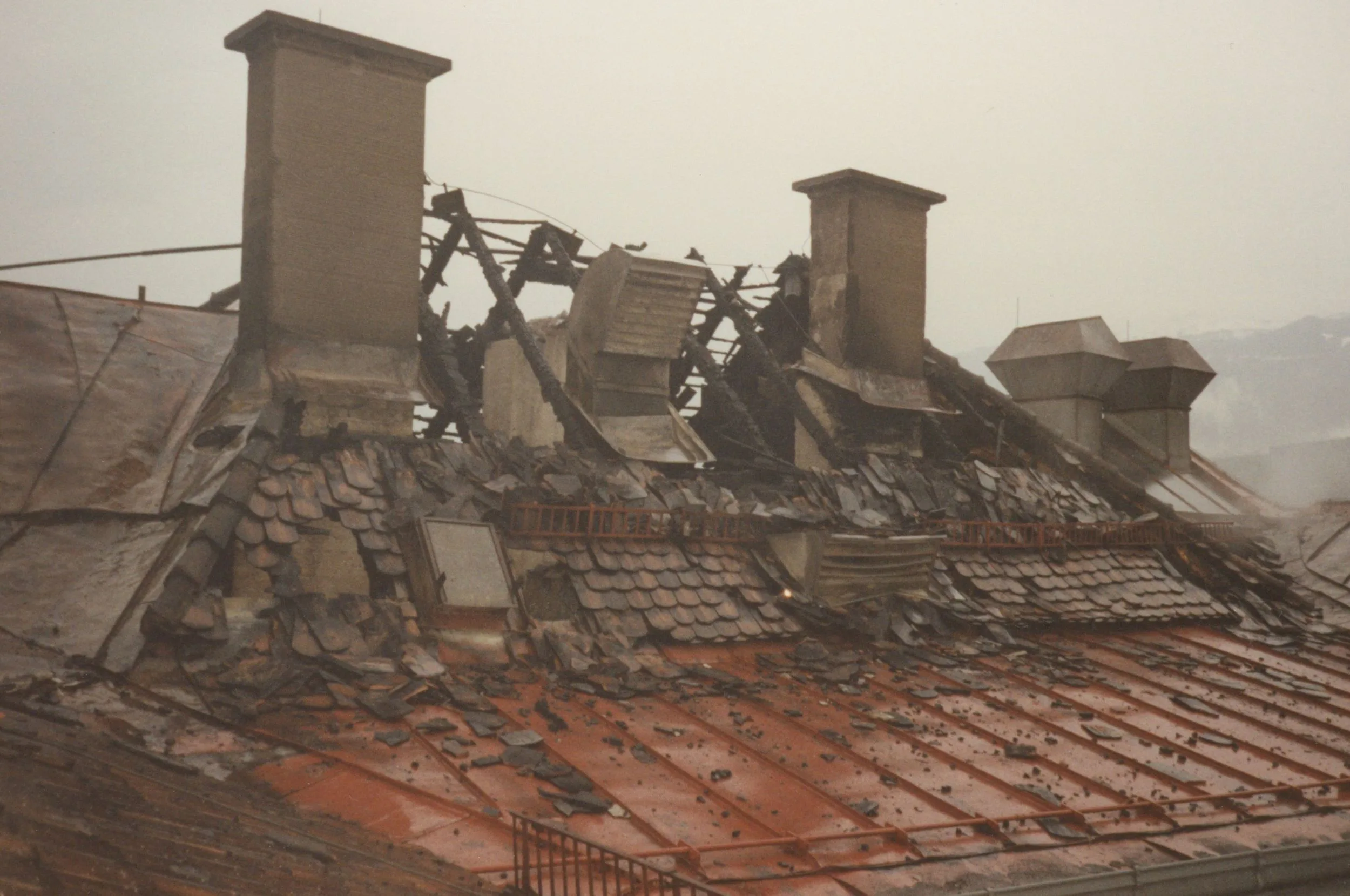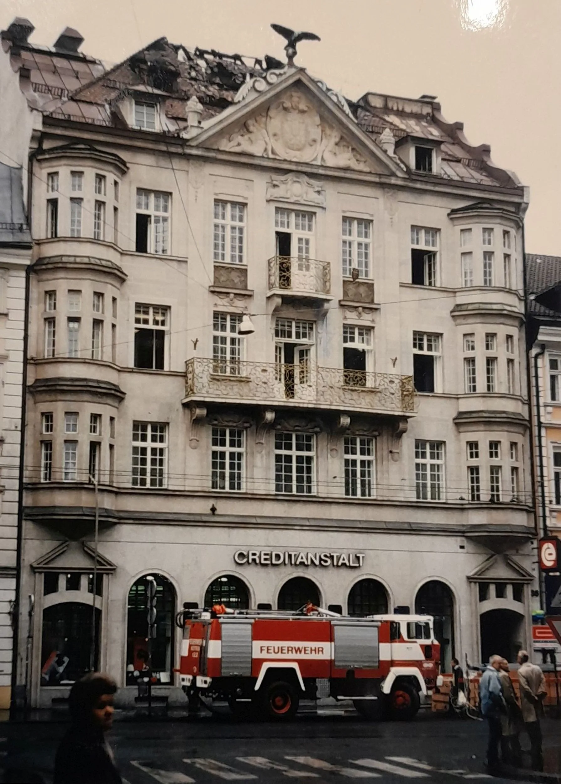 Weithin sichtbar waren die Flamen, die in den frühen Morgenstunden des 23. März 1990 aus dem Dach der Creditanstalt-Filiale in der Maria-Theresienstraße aufloderten. Das historische Bankgebäude wurde gerade renoviert. Vermutlich hatten Schweißarbeiten am Vortag zu einem Schwelbrand geführt, der jedoch unbemerkt geblieben war.