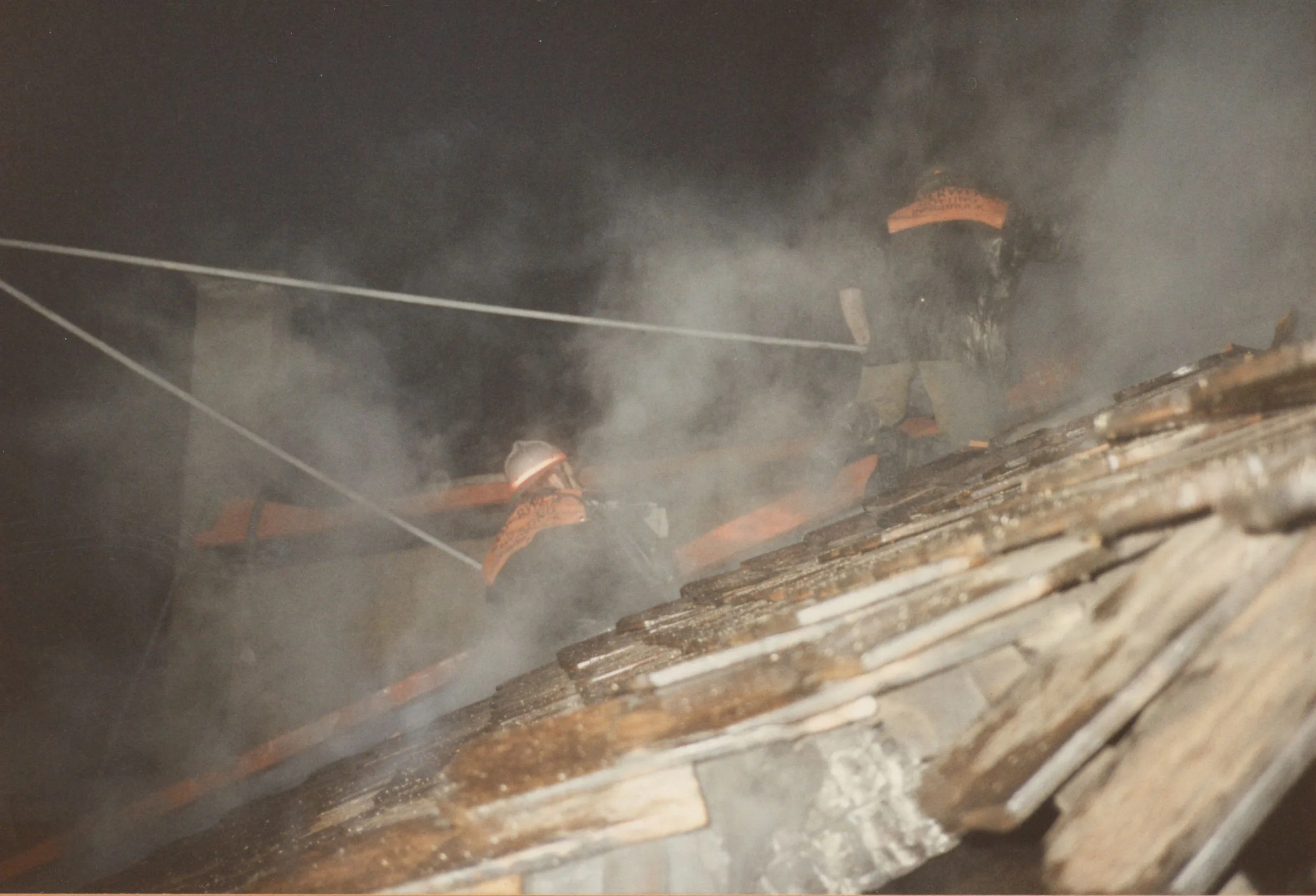 Das TLF 4500/500 der Berufsfeuerwehr Innsbruck rückte am Nachmittag des 24. März 1990 nochmals zur Kontrolle der Brandstelle aus. StAI, Ph-A-24670.