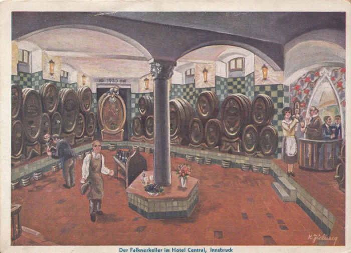 Das Titelbild zeigt eine Farbpostkarte auf der der Falknerkeller im Hotel Central in der Gilmstraße…