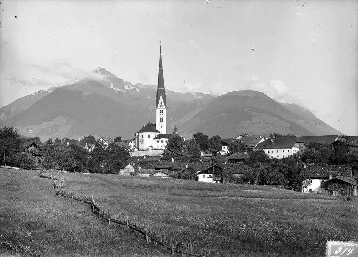 Dieses Foto zeigt Bauarbeiten an der Stahlkonstruktion der Innbrücke, die für die Erbauung der Karwendelbahn…