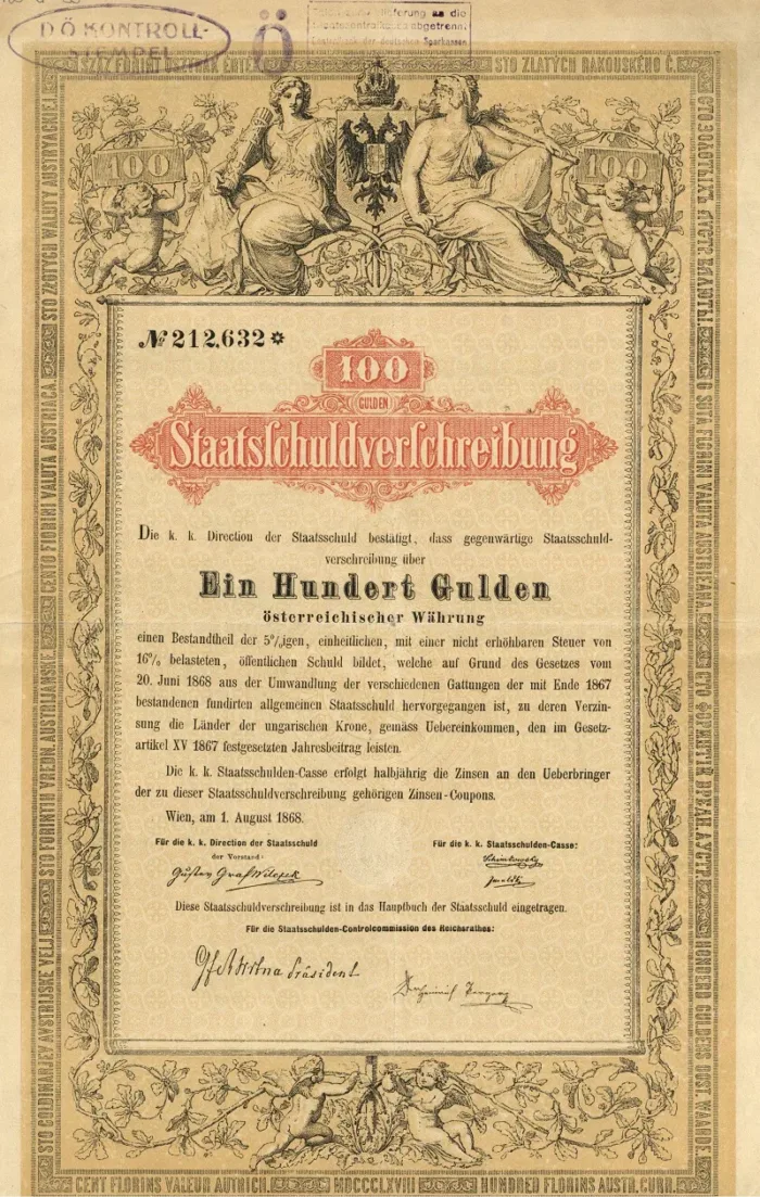 Hier zu sehen ist eine Staatsanleihe im Wert von 100 Gulden aus dem Jahre 1868…