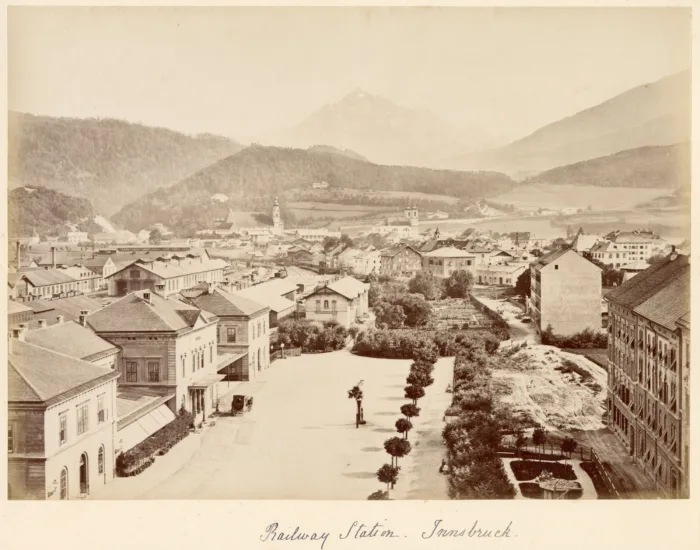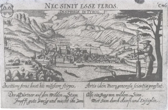 Auf diesem Stich ist ein noch sehr kleines Innsbruck zu sehen, mit gänzlich ummauerter Altstadt…
