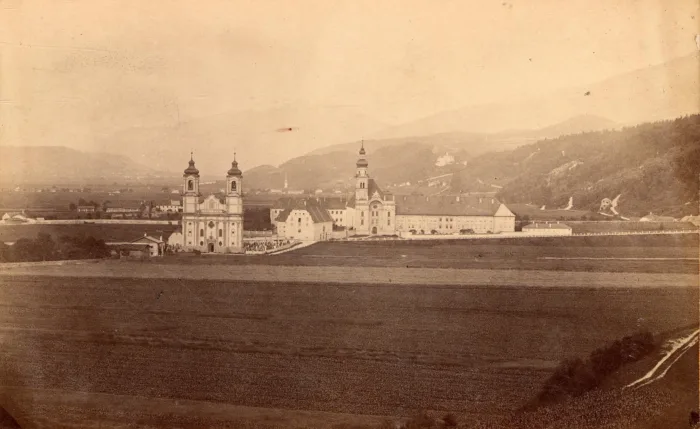 Das Titelbild zeigt eine schwarz-weiß Postkarte, die auf der Rückseite einen Sonderstempel "Wallfahrtspost Absam" trägt.…