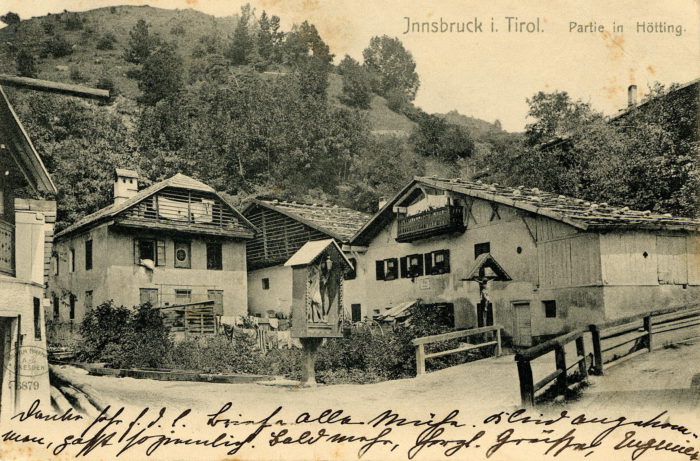 Die hier abgebildete Korrespondenz-Karte zeigt die Kreuzung Daxgasse-Bildgasse in Hötting, benannt nach dem bekannten Tiroler…