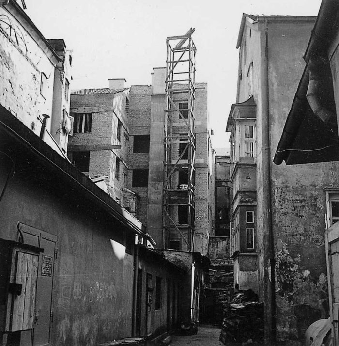 Wenige Jahre nach dem Ende des Zweiten Weltkriegs blicken wir in einen Hinterhof. Altbestand steht…