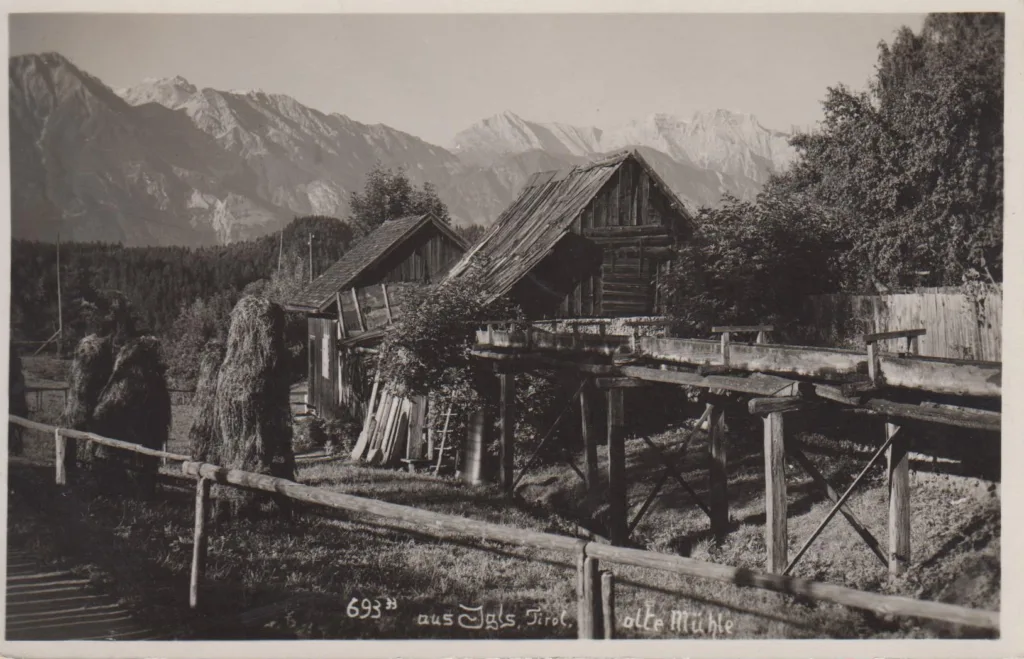Ich halte es für eine Sägemühle. Irgendwann hatten wir doch einen Beitrag aus der Gegend Römerhof – Badehaus Gasse. Ich glaube auch hinten den Lanser Kopf zu erkennen.