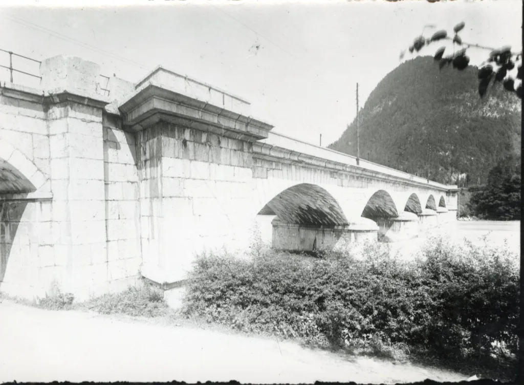 Ein Foto aus unserem Bestand, das die Brücke noch im Originalzustand zeigt, soll hier zum Vergleich mit der Lithografie ergänzt werden und helfen, ein besseres Gefühl für die Dimensionen und die architektonische Wirkung dieses Bauwerks zu vermitteln.