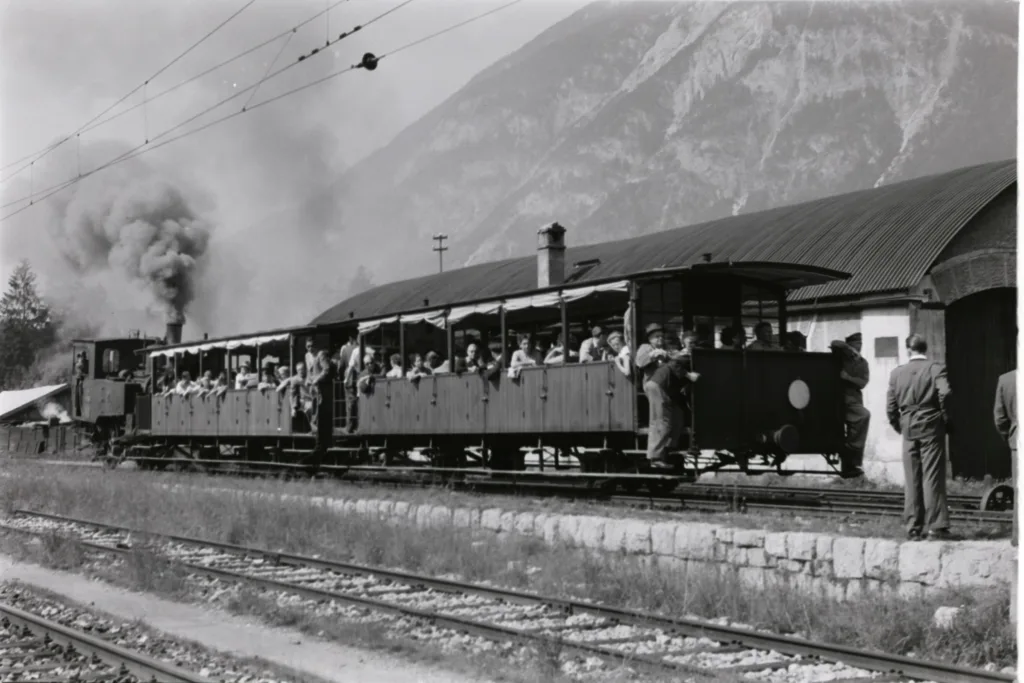 Mit der Ankunft im Bahnhof Jenbach betreten wir Neuland: Erstmals gibt es von einem unserer Ursprungsbahnhöfe keine Abbildung in unserem Erinnerungsalbum. Ob es nie eine Lithografie gegeben hat oder sie im Laufe der Zeit verloren ging, lässt sich heute leider nicht mehr klären. Das Fehlen dieses Bilddokuments hindert uns jedoch keineswegs daran, diesen Halt gebührend zu würdigen, denn glücklicherweise haben wir auch andere Bilder vom Jenbacher Bahnhof in unserer Sammlung, wie das Titelbild aus der Sammlung Kreutz, welches den Bahnhof inklusive Zug im September 1954 zeigt.