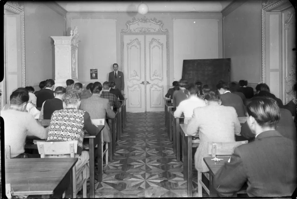 Die heute präsentierten Bilder bauen auf diesen Ausführungen auf und zeigen zwei Aufnahmen aus dem laufenden Schulbetrieb, ehe die alte Villa dem Neubau zum Opfer fiel. Auf dem Titelbild sehen Sie die Lehrküche, die bei flüchtigem Blick an eine Arztpraxis erinnert – wären da nicht der Standmixer und das Kochfeld.