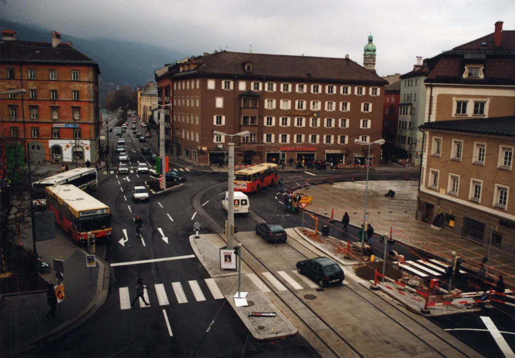 … Heute allerdings mit Blick Richtung Osten – der Zeitrahmen Winter 1994/5 bleibt also gleich. Im Bild zu sehen ist das Ischia-Gebäude (Marktgraben 1). Büromöbel Svoboda ist mittlerweile dem Studio Tyrler gewichen und links das Churrasco-Haus hat einen ordentlichen Aufputz erhalten. Auf welches Lokal die Sterndl unten an der Wand wohl verwiesen haben? Heute kann man dort auf jeden Fall an sonnigen Tagen dort zwischen Strömen von Studierenden auf einen Platz in der Marktbar warten. Auf der kleinen Verkehrsinsel in der Mitte sieht man gestreifte Latten mit Fahnen obendrauf. Diese wurden im Zuge der Neugestaltung des Areals an verschiedenen Stellen angebracht. Der Text lautete „Willkommen – Marktgraben, Innrain, Bürgerstraße“. Zuerst dachte ich, die lehnen nur provisorisch da, um verbaut zu werden, aber ich glaube, die sind da schon fix installiert…