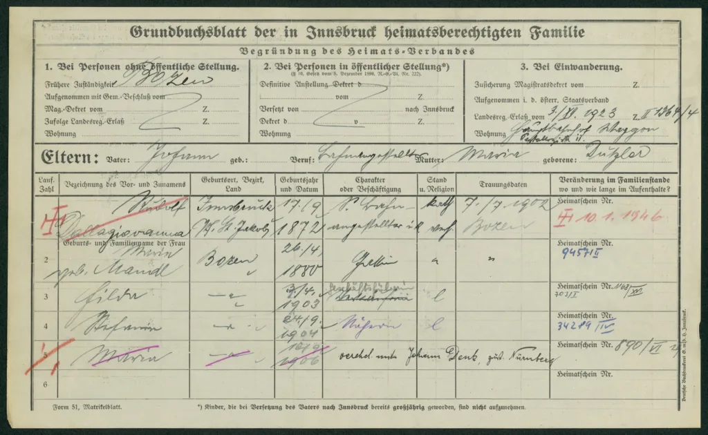 Mit auf der Los-Vorderseite, die als letztes Abgabedatum den 24. November 1924 nennt, stehen als Lotterie-Komitee Tischlermeister Josef Kößler und Rudolf Dallagiovanna, Bundesbahn-Adjunkt und Oberhaupt einer siebenköpfigen Familie. Auf der Heimatrechts-Karte steht als Adresse trocken: Hauptbahnhof Waggon.