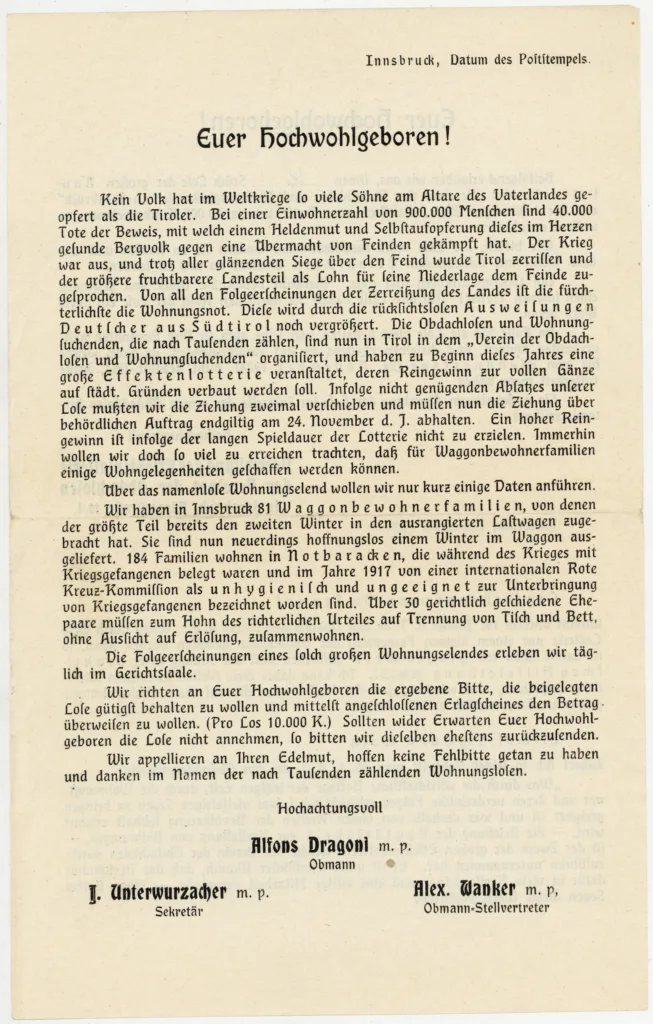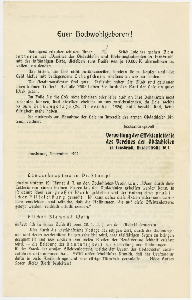 An die beiden ans Stadtarchiv überantworteten Lose war ein Begleitbrief geheftet, der nun schon eher Stirnrunzeln beim Autor dieser Zeilen verursachte: Offenbar waren beide Lose ohne jede Bestellung an bekannte Persönlichkeiten des Landes versendet worden, hier an einen Herrn Riml in Sölden. Die Lose blieben ungültig, so lange man sie nicht bezahlte. Ähnliche Keiler-Manöver kennt jede:r Selbstständige aus der Vorweihnachtszeit: Ein 12er Pack Weihnachtskarten wird verschickt, mit der Bitte doch dem Freundeskreis der einen oder anderen karitativen Organisation beizutreten. In jedem Fall wirken diese Marketing-Tricks heute genauso verzweifelt wie damals. Im Langschreiben wird ausführlich auf die Innsbrucker Wohnungsmisere verwiesen, auch eine Statistik der Waggonbewohner:innen ist dabei: 81 Familien sollen es allein in Innsbrucker Waggons sein, plus 184 Familien in ungeeigneten und unhygienischen Notbaracken.