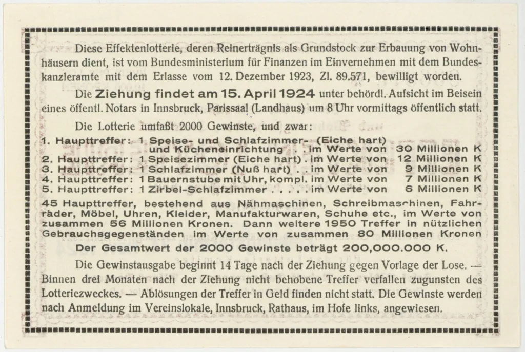 Letzte Woche hat Markus Wilhelm das obenstehende Los im Stadtarchiv vorbeigebracht, das man 1924 um wohlfeile 10.000 Kronen erwerben konnte. Zehntausend, das war dann auch der offizielle Umrechnungskurs am Ende dieses Jahres, als man für diesen Betrag genau 1 Schilling bekommen würde.