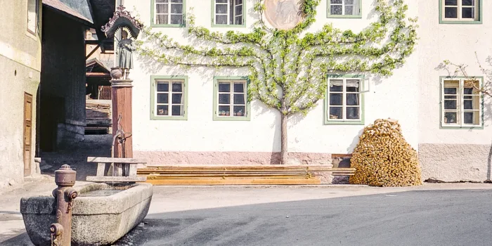 … zweifellos auch in die Kategorie „unscharf, aber gut“, wenngleich es nicht aus der Sammlung Kreutz stammt. Zum einen gibt es viel zu sehen, was sich so heute nicht mehr fotografieren lässt. Der Blick auf die beiden stattlichen Villen und den Turm der alten Höttinger Pfarrkirche ist längst verbaut …