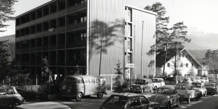 Zurück zu dieser Aufnahme. In der Bildmitte das Gebäude von Thurner Ofenbau. Der Mariahilfpark steht noch nicht. Hinten ist die Chirurgie in der Klinik bereits.