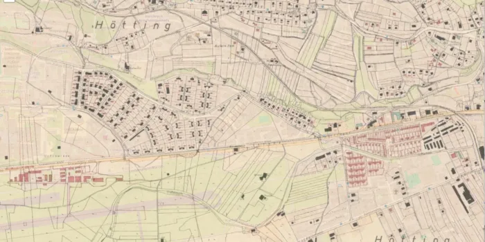 Was mich etwas irritiert, ist, dass das Leopoldstraßen-Gleis keine Fahrleitung zu haben scheint. Die Drähte im Bild oben von rechts nach links scheinen sich zu weit in Richtung des Fotograf:innenstandorts zu befinden und höher zu hängen, das sieht mir nicht nach Fahrdraht aus. Oder kann jemand Anderes erkennen? Wenn das so wäre, dann müsste es bedeuten, dass das Bild 1960 oder ein wenig später aufgenommen wurde, denn 1960 wurde das Gleis durch die Leopoldstraße, am Schluss nur noch eine Betriebsstrecke, stillgelegt und nicht lange danach überteert oder abgebaut.